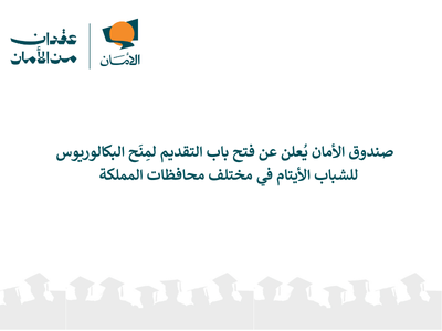 أعلن صندوق الأمان لمستقبل الأيتام عن فتح باب التقديم لمنح التعليم لدرجة البكالوريوس، والمخصصة للأيتام من مختلف محافظات المملكة. ويأتي ذلك استمراراً لرسالة الصندوق التي أطلقتها جلالة الملكة رانيا العبدالله عند تأسيسه عام 2006، والهادفة الى دعم الأيتام بعد سن الثامنة عشرة وتمكينهم من مواصلة تعليمهم وبناء مستقبلهم .