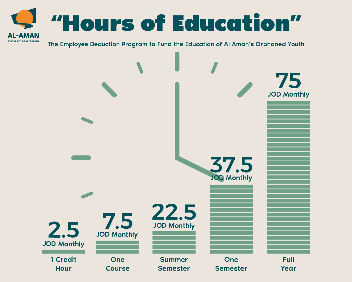The Hours of Education Program is Al Aman Fund’s employee giving program, designed to make ongoing support simple and sustainable. Once enrolled, your selected donation amount is automatically deducted each month to help cover tuition costs for orphaned youth, ensuring their education continues without interruption.